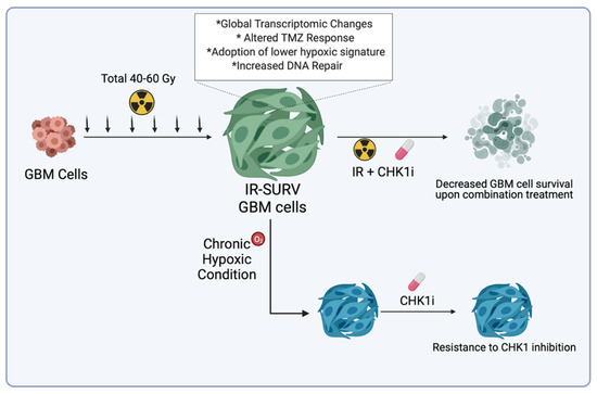 Glioblastoma is the most malignant primary brain tumor, and a cornerstone in its treatment is radiotherapy. However, tumor cells surviving after irradiation indicates treatment failure; therefore, better understanding of the mechanisms regulating radiotherapy response is of utmost importance. In this study, we generated clinically relevant irradiation-exposed models by applying fractionated radiotherapy over a long time and selecting irradiation-survivor (IR-Surv) glioblastoma cells. We examined the transcriptomic alterations, cell cycle and growth rate changes and responses to secondary radiotherapy and DNA damage response (DDR) modulators. Accordingly, IR-Surv cells exhibited slower growth and partly retained their ability to resist secondary irradiation. Concomitantly, IR-Surv cells upregulated the expression of DDR-related genes, such as CHK1, ATM, ATR, and MGMT, and had better DNA repair capacity. IR-Surv cells displayed downregulation of hypoxic signature and lower induction of hypoxia target genes, compared to naïve glioblastoma cells. Moreover, Chk1 inhibition alone or in combination with irradiation significantly reduced cell viability in both naïve and IR-Surv cells. However, IR-Surv cells’ response to Chk1 inhibition markedly decreased under hypoxic conditions. Taken together, we demonstrate the utility of combining DDR inhibitors and irradiation as a successful approach for both naïve and IR-Surv glioblastoma cells as long as cells are refrained from hypoxic conditions.
