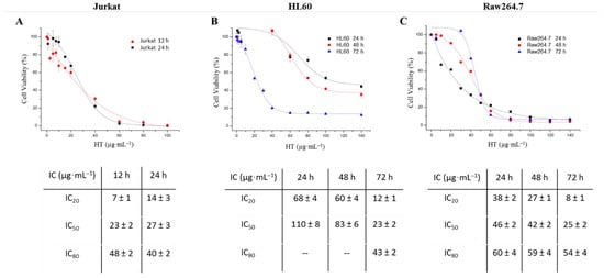 Then, 3 × 105 Jurkat cells were grown on 96-well plates and incubated with HT (0–100 μg mL−1). The plates were incubated at 12 and 24 h. In the case of HL60 (5 × 105 cells) and Raw264.7 (2 × 105 cells), the plates were incubated with HT (0–50 µg·mL−1 for HL60 and 0–140 µg·mL−1 for Raw264.7) at different times, 24, 48 and 72 h. Depending on this, different numbers of cells were grown to avoid confluence as follows: for 24 h, 20,000 cells per well; for 48 h, 17,000 cells; and for 72 h 14,000 cells.