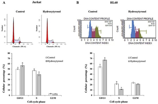 Effect of hydroxytyrosol on the cell cycle in Jurkat (panel A) and HL60 cell lines (panel B). Cell cycle analysis was performed with flow cytometry. Panel A corresponds to Jurkat cells and panel B to HL60 cells. Cells were treated with hydroxytyrosol IC50 for 24 h for Jurkat and 72 h for HL60 cells. Histograms from a representative experiment showing the effects of hydroxytyrosol on the cell cycle profile are represented at the top (Jurkat panel A and HL60 panel B). The lower part represents the percentage of cells in each of the phases of the cell cycle. Values are expressed as mean ± SEM (n = 3). Different capital letters indicate significant differences between treatments for each phase of the cell cycle (p < 0.01).
