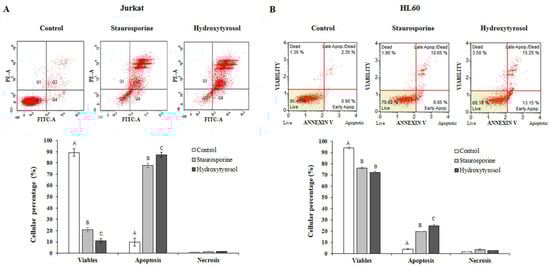 Effect of hydroxytyrosol on cell apoptosis levels in Jurkat (panel A) and HL60 (panel B) cell lines. Apoptosis values were obtained using flow cytometry. A positive control in the presence of staurosporine (1 μg·mL−1) was used. Panel A corresponds to Jurkat cells and panel B to HL60 cells. Cells were treated with hydroxytyrosol IC50 for 24 h for Jurkat and 72 h for HL60 cells. Top: Fluorescence diagrams from a representative experiment are depicted and show the effect of hydroxytyrosol on different cell states, viability, early apoptosis, late apoptosis, and necrosis (Jurkat panel A and HL60 panel B). Below: the percentage of cells in each of these states are represented. Values are expressed as mean ± SEM (n = 3). Different capital letters indicate the existence of significant differences (p < 0.01). Quadrants: Q1, necrosis; Q2, late apoptosis; Q3, living cells; Q4, early apoptosis.
