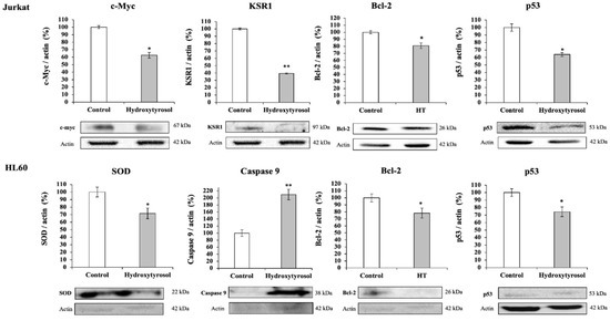 Effect of hydroxytyrosol (HT) on the expression levels of different marker proteins for cell proliferation and differentiation (c-Myc, KSR1), apoptosis (Bcl-2, p53, Caspase 9) and cellular oxidative stress (SOD) in Jurkat and HL60 cell lines controls and exposed to the IC50 concentration of HT for 24 h in Jurkat cells and 72 h in HL60 cells. Quantification of protein levels by densitometric analysis is shown in bar graphs. Results are means ± SEM (n = 9) and are expressed as percentage of expression compared to actin levels in Western-blot analysis. The presence of the asterisk indicates significant differences between the control and treated cells (* p < 0.01; ** p < 0.001). KSR1, Kinase suppressor of Ras 1; Bcl2, Anti-apoptotic B-cell lymphoma 2; SOD, Superoxide dismutase.