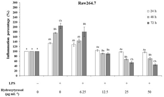 Effect of hydroxytyrosol on the percentages of inflammation measured in terms of nitric oxide (NO) production in Raw264.7 cells when these cells were previously stimulated with LPS (0.1 μg·mL−1) and cultured with different concentrations of hydroxytyrosol (0–50 μg·mL−1) at 24, 48 and 72 h. The percentage of inflammation of the negative control is represented as 100%. The test was performed in triplicate (n = 3) for each experimental condition. Capital letters indicate statistically significant differences (p < 0.05) in the same experimental condition (e.g., LPS (+) & HT (6.65 μg·mL−1)) between the different times studied (24, 48 and 72 h). Lowercase letters indicate significant differences (p < 0.05) between the different experimental conditions for a specific time (e.g., 24 h). LPS, Lipopolysaccharide.