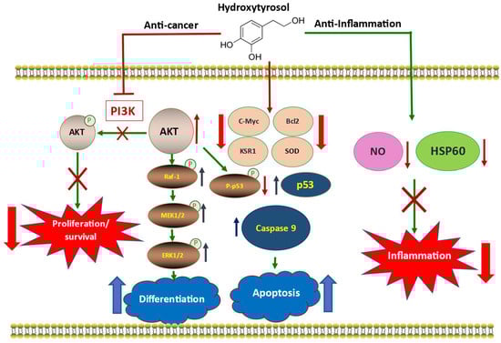 Schematic representation of the main molecular events responsible for the anti-cancer and anti-inflammatory capacity of hydroxytyrosol. The incorporation of HT into the cell triggers a profound inhibition of PI3K activity within the AKT/PI3K signaling pathway. This inhibition allows AKT to avoid phosphorylation, keeping its activity intact, generating a series of molecular changes that lead to a decrease in the proliferation and survival of cancer cells together with an increase in cell differentiation and apoptosis. The activity of AKT facilitates the development of the MAPK pathway through MEK1/2/ERK1/2, which together with a decrease in the expression levels of c-Myc and KSR1 favors cell differentiation. In addition, HT reduced the levels of the inactive form of p53, increasing the levels of the active form, as well as those of caspase 9 and induced a decrease in the anti-apoptotic protein Bcl-2, which led to a significant increase in the recognition of apoptosis of cancer cells. In parallel, the significant reduction in inflammation caused by the administration of LPS together with a drastic decrease in the expression levels of HSP60 and SOD after treatment with HT allows us to recognize the important anti-inflammatory activity of this natural polyphenol.