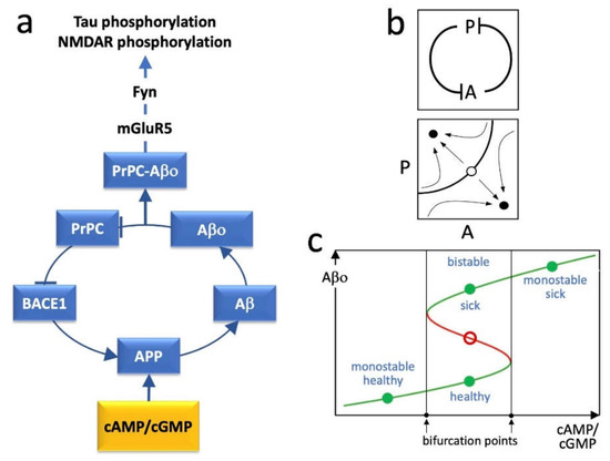 In conclusion, our model provides a unifying explanation for a large body of evidence accumulated over years of AD studies. However, while this is a strong indication of validity, distinct proof-of-concept experiments remain necessary. One of the most critical aspects of the analysis is the derivation of a suitable set of ODEs that represent the interactions between the variables of the system. The ODE formulation will have to be achieved from literature data and through the design of targeted experiments (e.g., see [21]). By finely manipulating the concentration of cyclic nucleotides within neuronal cells, it will have to be shown that a positive feedback loop depending on cyclic nucleotides and PrPC is able to regulate Aβ production through a bistable system. Furthermore, under cyclic nucleotide dysregulation, the bistable switch will have to induce high levels of Aβo, followed, for example, by hyperphosphorylation of tau, as a marker of the pathophysiological transition towards the disease. Subsequently, the loop system will have to be validated using animal models, to demonstrate that cyclic nucleotide manipulation can influence the onset/regression of the disease in vivo.