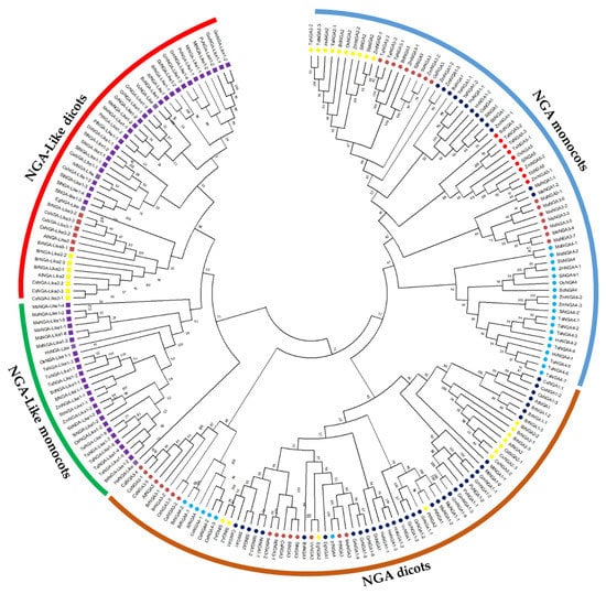 The evolutionary history of the NGA TF family was investigated by assessing the phylogenetic relationship to classify the NGA proteins. The phylogenetic tree was constructed based on the obtained protein sequences of 18 dicots and 7 monocots (Figure 1; Table S1). The phylogenetic analysis demonstrated that both the NGA and NGA-Like sequences of dicots and monocots diversified into different clades for (Figures S1 and S2). Furthermore, the NGA and NGA-Like sequences of dicots were grouped based on families such as Brassicaceae (A. thaliana, B. rapa, Camelina sativa), Solanaceae (S. lycopersicum, S. tuberosum, C. annum, N. tabacum), and other species such as Populus trichocarpa, Phaseolus vulgaris, Medicago truncatula, etc. (Figure S1).