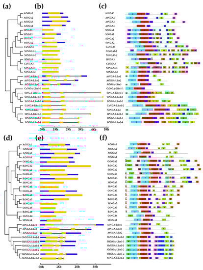 The gene structure analysis of Solanaceae members followed a similar pattern as that of A. thaliana (Figure 2a–c). All the NGA genes possessed single introns with some genes possessing untranslated regions (UTRs) and some without UTRs. Among all of the NGAs, StNGA3 included the longest 3′ UTR of 4154 bp. Similarly, the NGA-LIKE genes contained three exons and two introns with an exception for AtNGA-LIKE3 and NtNGA-LIKE with two exons and one intron as well as CaNGA-LIKE1-1 with only a single exon and no UTRs. Poaceae members such as rice, sorghum, and Brachypodium also followed a similar fashion as above-mentioned (Figure 2d–f). The NGA-LIKE gene in Poaceae with two exons and a single intron was observed in OsNGA-LIKE1-2. The number of exons (triple exons and double exons) in a gene is not consistent; however, the results suggest that these genes are conserved in gene structure.