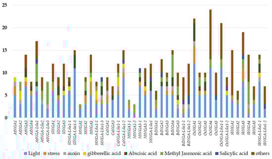 The promoter cis-element analysis was performed as followed by Wei et al. [29]. We considered the 1500 bp upstream region of the NGA genes and looked for the presence of various cis-elements that include light, hormones (abscisic acid [ABA], gibberellic acid [GA], auxin, methyl jasmonic acid [MeJA], and salicylic acid [SA]), stress-responsive elements (drought inducibility, defense and stress response), and other cis-elements related to anaerobic induction, circadian control, meristem development, flavonoid biosynthesis, low-temperature responsive, zein metabolism, seed-specific regulation, At-rich DNA binding protein, endosperm expression, anoxic specific inducibility, and cell cycle regulation. The details of the promoter cis-elements of NGA and NGA-LIKE are represented in Figure 3.