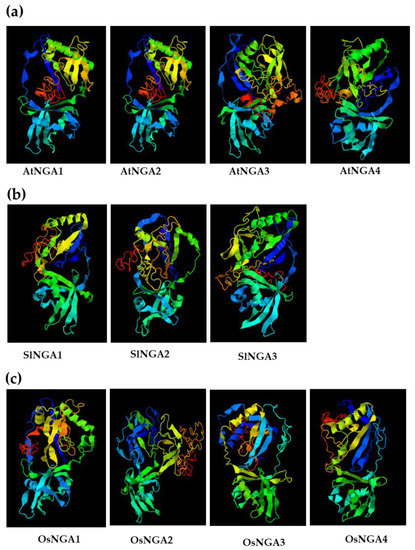 The 3D-structure of the NGATHA proteins in (a) A. thaliana, (b) S. lycopersicum, and (c) O. sativa L. Japonica. The three-dimensional structures were acquired using I-TASSER (https://zhanggroup.org/I-TASSER/; accessed on 18 January 2022) [35].