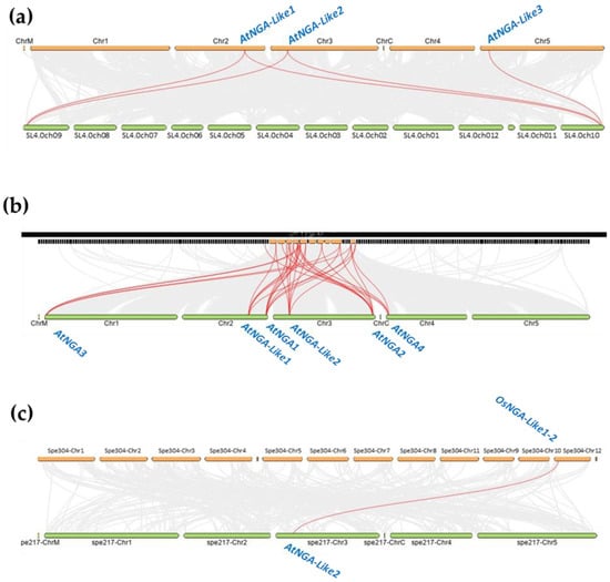 The gene duplication or synteny analysis of the NGATHA genes of A. thaliana with (a) S. lycopersicum; (b) B. rapa, and (c) O. sativa L. Japonica. The grey lines (in the background) represent collinear blocks between the respective genomes. The red lines indicate the syntenic gene pairs of S. lycopersicum, B. rapa, and O. sativa L. Japonica with A. thaliana.