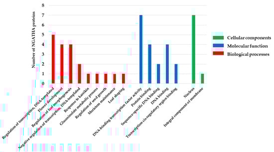 The GO annotation and classification of NGATHA proteins using Blast2GO. Results are summarized for the three main GO categories (BP, MF, and CC). The X-axis includes the most abundant GO terms. The Y-axis represents the number of NGATHA proteins.