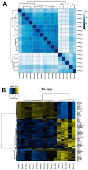 Analysis of gene expression between suicide and control groups. (A) Hierarchical clustering of 16 RNA-seq samples based on the Euclidean distance. A heatmap of the distance matrix shows the similarities and dissimilarities between the samples as calculated from the rlog transformation of the count data. (B) Hierarchical clustering heatmap of Pearson correlation coefficients between suicide and control individuals. The heatmap represents the top 500 protein-coding gene expression for the different groups in columns, with a dendrogram presented at the top of the heatmap. Proteins were selected based on their variability between all samples. Counts were log-transformed, normalized, and used for clustering based on similarity in expression patterns. The x-axis represents the sample. The y-axis represents the top 500 differentially expressed genes. The color represents the log10 transformed gene expression level. The scale shows the level of expression: the yellow color means high, the blue color means low, while the black color represents medium expression level.