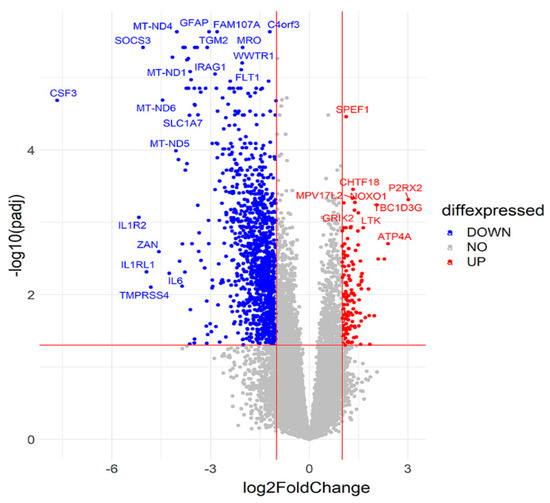 Visualization of RNA-seq results. Volcano plot showing the log2 fold change (log2FC) of gene expression and the statistical significance of the differential expression (DE) analysis performed between suicide and control individuals. The x-axis represents the log2 fold change of genes, while the y-axis represents the −log10 of the corrected p-values (padj) for the different pairs of conditions. Each dot represents a gene and the colored areas represent the DEGs that met the following selection criteria: log2FC of at least ±1 (log2FC ≥ 1 or ≤−1) and Benjamini and Hochberg-adjusted p-value < 0.05. Upregulated genes are shown in red, while the downregulated ones are blue. The top 40 significant DEGs are labeled.
