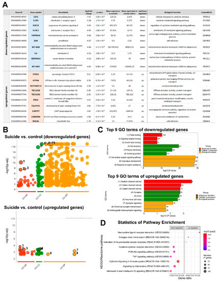 To understand how the DEGs from the DMPFC relate to suicidal behavior, Gene Ontology (GO) classification was performed. Figure 3A shows the top 10 down- and upregulated DEGs. The top three downregulated genes were CSF3, IL1R2 and SOCS3. They all play a critical role in inflammation. The top three upregulated genes were P2RX2, ATP4A and BX276092.9. P2RX2 and ATP4A are found in the plasma membrane and both of them have a role in ATP binding and ion transport. BX276092.9 is a barely characterized protein. Additional GO functional enrichment analysis identified significant differences in more than 500 functional pathways of downregulated genes and 37 functional pathways of upregulated genes at adjusted p-value < 0.05 (Supplementary File S2). A comparison with the Allen Human Brain Atlas (AHBA) expression database showed that some of the altered genes are expressed in specific cell types. For example, one of the top downregulated genes, the MT-ND5, is produced in FEZF2 and RORB expressing excitatory and SST+ inhibitory neurons. The LORICRIN, which is one of the top upregulated genes, is expressed in THEMIS expressing excitatory neurons (Supplementary File S6).