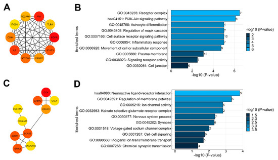 Computational methods analyzing protein protein interaction (PPI) networks are useful for understanding the biological meaning of gene expressional alterations. Therefore, we used the STRING online database (http://string-db.org, (accessed on 11 November 2021)) to construct the PPI networks of down- and upregulated DEGs, which were then transferred into the Cytoscape software. Analysis of top DEGs was achieved using the degree method in cytoHubba where the top 10 down- and upregulated DEGs were identified (Figure 4A,C). Enrichment analysis of the top 10 downregulated DEGs s (Figure 4A) through stringApp revealed that these genes are mainly associated with astrocyte differentiation (GO:0048708), regulation of MAPK cascade (GO:0043408) and cell surface receptor signaling pathway (GO:0007166) (Figure 4B); meanwhile, the top 10 upregulated DEGs (Figure 4C) were associated with regulation of membrane potential (GO:0042391), nervous system process (GO:0050877) and cell–cell signaling (GO:0007267) (Figure 4D). The complete list of genes and their associated pathways can be found in Supplementary File S3. Using the AHBA database for comparison, we found that most of the top downregulated genes are abundantly expressed in astrocytes. In turn, the top 10 upregulated genes are expressed in excitatory and inhibitory neurons and can be also found in oligodendrocytes (Supplementary File S6).