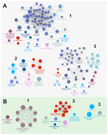 Co-expression network analysis and functional annotation of DEGs. Visualization of statistically overrepresented GO terms in a given set of genes from the three main co-expression network clusters (1–3) using the ClueGO plugin. Functional annotation of DEGs using ClueGO enriched by downregulated (A) and upregulated DEGs (B). Each node refers to a specific Gene Ontology (GO) Biological process term and is grouped based on the similarity of their associated genes. The size of the nodes is equivalent to the statistical power of significance of each term: the larger the node size is, the smaller the p-value is. Node colors represent different functional groups. The emphasized term of each functional group is given by the most significant term of the group.