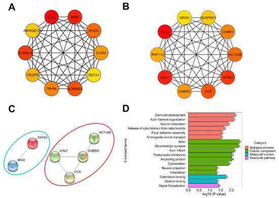 Using the CytoHubba plugin in Cytoscape, we determined the top 10 hub genes of down- and upregulated co-expression networks according to their highest Maximal Clique Centrality (MCC) scores (Figure 6A,B). We constructed a protein–protein interaction network (PPI) for all the top 10 down- and upregulated hub genes using the STRING database, out of which two of the downregulated and four of the upregulated genes were connected to each other (Figure 6C). In GO and Reactome pathway enrichment analyses of hub genes, we identified enriched gene sets related to developmental processes, such as actin filament organization, neuron maturation or anterograde axonal transport (Figure 6D). We found similar results when analyzing cell type expressing features of the top hub genes by using the AHBA database, where most of the downregulated hub genes are expressed in astrocytes, while the upregulated ones can be found in excitatory and inhibitory neurons and oligodendrocytes (Supplementary File S6). The top 10 hub genes from the co-expression networks and their functional annotation are listed in Supplementary File S5.