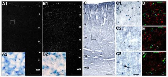 As a functionally intriguing validated DEG, NECAB2 was selected for analysis of its distribution within the DMPFC. In situ hybridization histochemistry was applied in a control and a suicidal individual to localize the expression of NECAB2 mRNA. The hybridization signal was abundant in layers II–VI (Figure 7A,B). NECAB2 immunolabeled cells showed the same distribution (Figure 7C). Immunolabeling also revealed that NECAB2 is present in two different interneuron subtypes. Most of the NECAB2-positive interneurons had small size cell bodies, while some of them demonstrated large soma (Figure 7(C3)). The larger interneurons were located in deep layers; meanwhile, the smaller ones were distributed in the upper layers, predominantly in layer II (Figure 7(C1,C3)). Immunolabeling also revealed that NECAB2 is present not only in the somato-dendritic compartments, but also in axon terminals in neurons (Figure 7(C2,C3)). To determine whether NECAB2 protein is also present in glial cells, we performed combined immunolabeling for Iba1 (a microglia marker) and S100B (an astrocyte marker) with NECAB2. The lack of colocalization indicates that NECAB2 is not expressed in glial cells (Figure 7D–F).