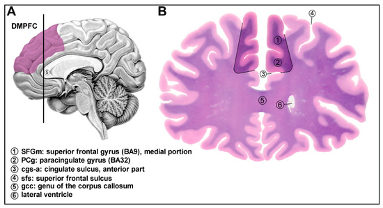 A representative view of the human brain region was dissected in the study. Details on the anatomical origin and structure of the dissected region. (A) The location and topographical extension of the dissected area, the dorsomedial prefrontal cortex (DMPFC) is shown in lilac color on the medial surface of the human brain. The vertical black line represents the cutting line used to obtain the coronal section illustrated on the right panel. (B) Coronal section of the human brain represents the DMPFC (1 + 2). The dissected area analyzed in this study is highlighted and demarcated by black lines. Landmarks and boundaries are notified by numbers. The section was stained using the Levanol-Fast Cyanine 5RN method.