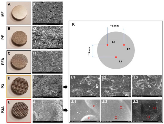 Ti6Al4V surface morphology. The right panel shows typical images of the different surfaces (A–E), while the middle panel shows their microscale SEM images (magnification: 300× for MF, PF and PFA and 500× for P3 and P3A, respectively) (F–J). In the right panel, representative secondary electron (SE) images were used to characterise the nanostructure of the porous samples, P3 and P3A. Images at 80 K× magnification were taken from both P3 (I.1, I.2, I.3) and P3A groups. In panel (K), schematic of image locations (indicated as L1, L2 and L3, respectively) for sample group P3 and P3A. Red circles in (J.1) indicate nanostructures with an average size of ~10 nm. An accelerating voltage of 2 kV was used.