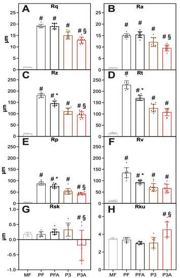 Measurement of roughness parameters on a microscale using an optical profilometer. Parameters evaluated: (A) mean roughness (Rq), (B) average roughness (Ra), (C) mean maximum profile height (Rz), (D) maximum profile height (Rt), (E) maximum profile peak height (Rp), (F) maximum profile valley depth (Rv), (G) Skewness (Rsk) and (H) Kurtosis (Rku). Statistical significance vs. MF was indicated by # (MF vs. other samples), while the symbol * means significant differences between PF and PFA (PF vs. PFA) and § between P3 and P3A (P3 vs. P3A).
