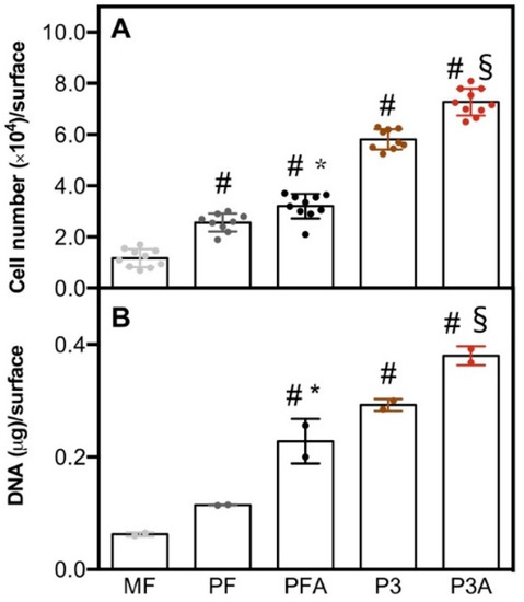 Cell number and DNA content. hBM-MSCs were cultured on each scaffold for 7 days and cell response was assessed by measuring the number of cells by the metabolic assay based on viability (A) and DNA content (B). Bars represent mean values ± standard deviation (SD). Statistical significance vs. MF was indicated by # (MF vs. other samples), while the symbol * indicates differences between PF and PFA (PF vs. PFA), and § between P3 and P3A (P3 vs. P3A).
