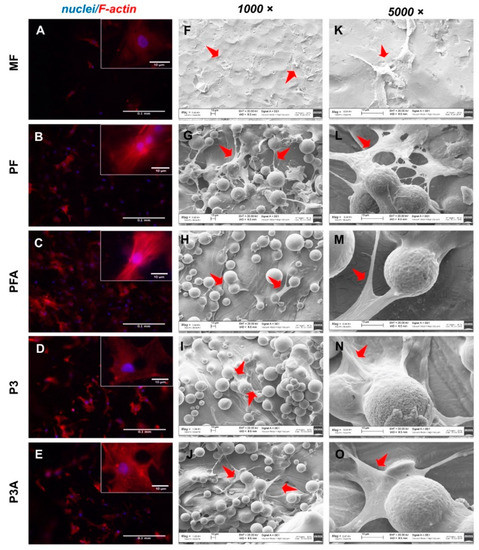 Cell morphology and distribution. The morphology of hBM-MSCs was examined by fluorescence microscopy (A–E) and scanning electron microscopy (SEM) (F–O) after 7 days of culture. The organisation of the cytoskeleton was observed after F-actin staining (red) and counterstaining of the nuclei (blue) at 10× magnification (scale bar: 100 µm). Magnified areas of the cells are shown in the insets (scale bar: 10 µm). Representative SEM images were collected at higher magnifications (1000× and 5000×). The red arrows show the filopodia-like extensions of the adhered cells on all tested surfaces.