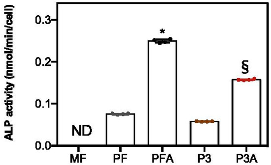 ALP activity. hBM-MSCs were cultured on each scaffold for 7 days and ALP activity was determined as described in the Materials and Methods section. ND = not detectable. Bars represent mean values ± SD. Symbol * indicates differences between PF and PFA (PF vs. PFA), and § between P3 and P3A (P3 vs. P3A).