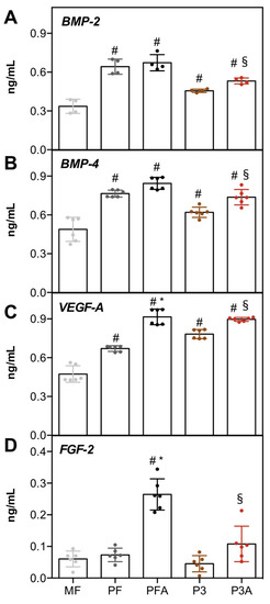 Measurement of BMP-2, BMP-4, FGF-2, and VEGF-A secretion in cell culture medium. hBM-MSCs were seeded on different Ti surfaces, and after 7 days, the cell culture medium was analysed for BMP-2 (A), BMP-4 (B), VEGF-A (C) and FGF-2 (D) by ELISA assay. Results (in ng/mL) are expressed as mean ± SD. Statistical significance with respect to MF was indicated by # (MF vs. other samples), while the symbol * indicates differences between PF and PFA (PF vs. PFA), and § between P3 and P3A (P3 vs. P3A).