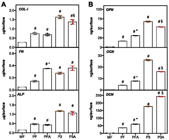 Quantification of bone-ECM protein deposition. Protein quantification of COL-I, FN, ALP, OPN, OCN and DCN produced by hBM-MSCs cultured on different Ti surfaces at day 7 of culture was assessed by ELISA assay as described in Materials and Methods Section. Data are expressed as µg/surface (A) and ng/surface (B), respectively. Statistical significance with respect to MF was indicated by # (MF vs. other samples), while the symbol * indicates differences between PF and PFA (PF vs. PFA), and § between P3 and P3A (P3 vs. P3A).