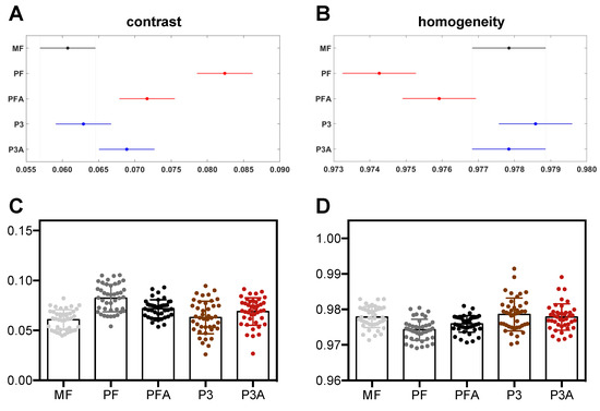 Haralick texture analysis of SEM images. Computation of Haralick’s contrast (A) and homogeneity (B). The circles represent the means of the contrast or homogeneity, whereas the horizontal bars are the 95%-confidence intervals for the difference between means (i.e., in the comparison of two biomaterials, non-overlapping horizontal bars show statistical significance with p < 0.05). Contrast and homogeneity represented as mean value ± SD ((C,D), respectively).
