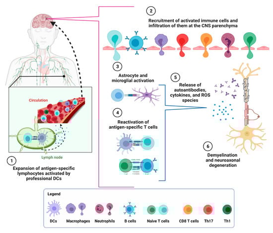 The immune interplay in MS pathogenesis. MS has a heterogeneous presentation and a robust immune component that underlies its development. (1) Autoantigens against the myelin basic protein (MBP) and the myelin oligodendrocyte glycoprotein (MOG) are released into circulation and captured by professional dendritic cells (DCs), which present them to naive T cells in secondary lymphatic organs. In parallel, B cells are activated mainly in CSF. (2) Anti-MBP and anti-MOG antibodies and chemokines allow the recruitment of activated T effector and innate cells infiltrating the CNS parenchyma due to altered permeability of the blood-–brain barrier (BBB). (3–4) Effector T and B cells are re-activated inside the CNS by astrocyte and microglial cells, (5) increasing local pro-inflammatory cytokines and reactive oxygen species (ROS) production, (6) which destroys the myelin sheath, thereby causing demyelination, oligodendrocyte loss, gliosis, and neuroaxonal degeneration. This damage is observed in patients as demyelinated areas called plaques, which are the distinctive feature of MS. Created with BioRender.com (accessed on 1 June 2022).