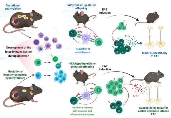 Thyroid hormone deficiency during gestation increases the immune response of the offspring after EAE induction. During the period of gestation, development and migration of immune cells usually occur properly; however, when it takes place under conditions of THs deficiency, this developmental process is altered. The offspring gestated in HTX, or hypothyroidism that was challenged with EAE in adulthood, have an early and severe disease onset that involves a more significant deterioration of the myelin sheath compared to progeny gestated in euthyroidism, which have lower susceptibility to suffering from the disease with less deterioration of the myelin sheath. Furthermore, HTX–Treg lymphocytes have a reduced suppressive capacity and a lower secretion of IL-10, establishing an imbalance of self-tolerance, compared with progeny gestated under euthyroid conditions who have Treg lymphocytes capable of exerting the suppressive effect correctly. Created with BioRender.com (accessed on 1 January 2022).