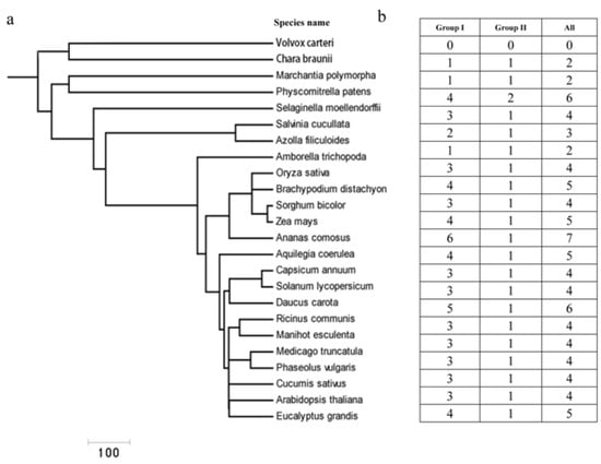 We used the BLASTP method and a hidden Markov model (HMM) algorithm to search for the Cu/Zn SOD genes in a comprehensive dataset containing different plant species ranging from lower to higher plants []. In total, 87 sequences were retrieved from 21 different plant species (Supplementary Table S1). Among them, Cu/Zn SOD genes were found to be present in major lineages of green plants, including Charophyte (e.g., C. braunii), Bryophyte (Marchantia polymorpha, Physcomitrella patens), Pteridophyta (Selaginella moellendorffii), and angiosperms (e.g., A. thaliana, Oryza sativa) (Figure 1a,b). The copy number of Cu/Zn SOD genes varied considerably between the different plants, ranging from two in the green alga C. braunii to four in A. thaliana (eudicot), with the highest number of seven in Aquilegia coerulea (eudicot). No Cu/Zn SOD proteins were detected in the draft genomes of the Chlorophyte Volvox carteri. Further investigation revealed that the copy number variation in different plants was mainly due to the difference in the phylogenetically defined group I (Figure 1b); in the other group (II), only one or two copies were found (e.g., the copy numbers were nearly constant).