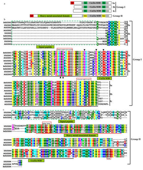 All the Cu/Zn SOD proteins were divided into two groups (group I and group II) based on whether they contained the “heavy metal-associated domain” or not. Group I was further categorized into subgroups based on the possession of other conserved domains or motifs. For group I, one subgroup (Ia) had an N-terminal signal peptide, which was indicative of secretion from or localization to organelles; another subgroup (Ib) lacked this domain and appeared to be localized to the cytosol; the third group (Ic) possessed a relatively long N-terminal sequence. All three of these subgroups possessed two conserved Cu/Zn SOD signatures (S1 and S2). The members of group II contained, as well an N-terminal signal peptide, a heavy metal-associated domain and two conserved metal-binding motifs (designated M1 and M2) (Figure 2a).
