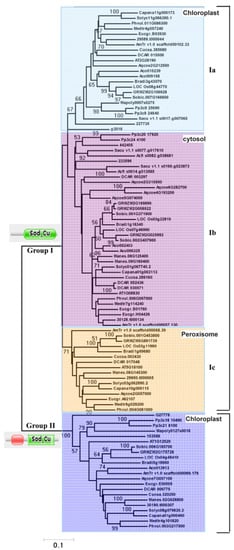In addition, Figure 3 displays phylogenetic relationships of Cu/Zn SOD proteins from group Ib where there are examples of lineage-specific gene expansions, as was the case for the ferns (A. filiculoides, S. cucullate, and S. moellendorffii) and monocot (O. sativa, S. bicolor, Z. mays, and B. distachyon) (Figure 3). In addition, species-specific expansions were also observed in group Ia (A. comosus) and group Ib (E. grandis, M. esculenta, D. carota, and A. comosus) (Figure 3). Usually, these can result in the expansion of one functional class of Cu/Zn SOD proteins.