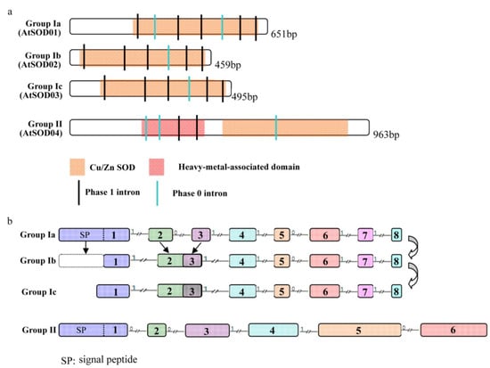 We also found that the length of the first exon varied between groups Ia, Ib, and Ic (Figure 4b). Further analysis showed that the 5′-terminal of the first exon in Cu/Zn SOD genes from groups Ib and Ic was reduced compared to those from group Ia, leading to a loss of signal peptides and indicating that shifts in subcellular localization had occurred during the process of plant evolution.