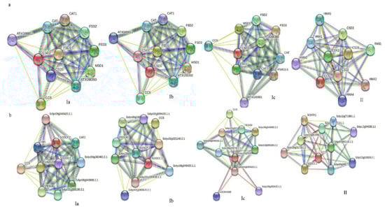 Next, we further analyzed the potential protein–protein interactions of Cu/Zn SODs from A. thaliana and tomato using the online web tool (https://string-db.org/, accessed on 14 December 2021). The results showed that three Cu/Zn SOD proteins (AtCSD1, AtCSD2, and AtCSD3) from A. thaliana are associated with known SOD proteins (Fe-SOD, Mn-SOD) in the interaction network. Moreover, a strong interaction between CSDs and the copper chaperone for superoxide dismutase (CCS) was observed. It is well-known that CCS is responsible for the transfer of Cu2+ into the cytoplasm, which increases the concentration of Cu2+ in the cytoplasm, thereby promoting the expression of CSD1 []. Additionally, we also found a high level of interaction between CSDs and other antioxidant enzymes, such as catalase (CAT). The findings imply that, in plant antioxidant enzyme systems, these two types of enzymes might respond to various biotic and abiotic stresses in a synergetic manner (Figure 5a). Interestingly, a similar phenomenon also occurred in tomato (Figure 5b).