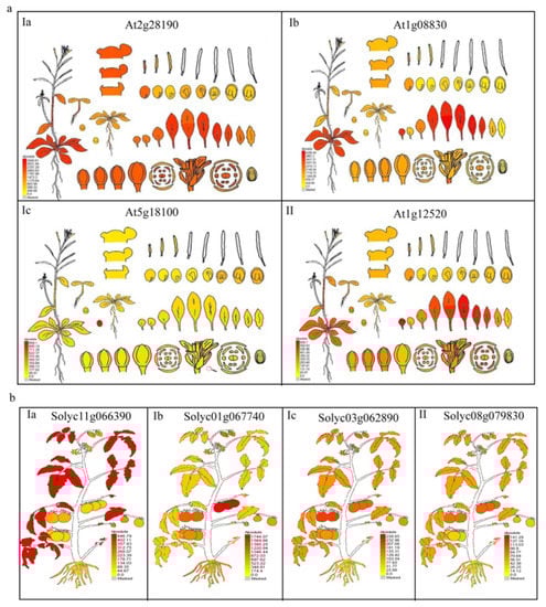 Next, differences in gene expression in plant organs were analyzed using online tools (http://bar.utoronto.ca/, accessed on 14 December 2021). Under normal conditions, all the Cu/Zn SOD genes from A. thaliana and S. lycopersicum were constitutively expressed in different tissues (Figure 6a,b). In A. thaliana, three Cu/Zn SOD genes from groups Ia, Ib, and II, respectively, were found to be expressed in all organs tested and were preferentially expressed in leaves; however, the Cu/Zn SOD gene from group Ic had tissue-specific or preferential expression patterns in seeds (fruit). In tomato, similar expression patterns of Cu/Zn SOD genes from different groups were observed. For example, the preferential expression of the Cu/Zn SOD genes from group I and group II was observed for leaves, but the Cu/Zn SOD genes from group Ic were preferentially expressed in fruit. We found that the Cu/Zn SOD genes from the same subgroups had similar expression patterns, which suggests potential functional conservation during the long evolution process.