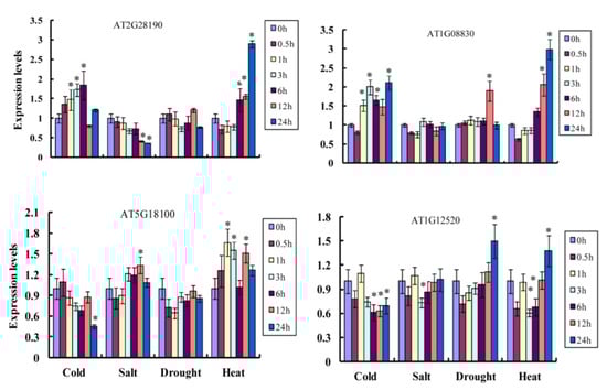 The expression pattern of Cu/Zn SOD genes in Arabidopsis thaliana under different types of stresses, including cold, heat, salt, and drought. Statistically significant differences are indicated p < 0.05 by star (*) (Student’s t-test).