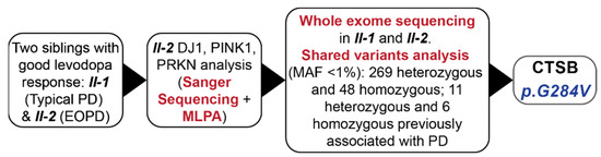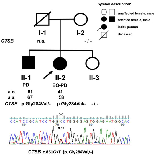 Parkinson’s disease (PD) is the second most common neurodegenerative disorder [1]. Clinical symptoms include bradykinesia, resting tremors, muscular rigidity, and a good response to levodopa or dopamine-agonist treatment [2]. The degeneration of dopaminergic neurons in the substantia nigra and the accumulation of α-synuclein are the main pathological hallmarks of PD [3]. It is mostly a sporadic disease, but about 10% of cases are familial [4]. Mutations in PD-related genes are usually found in patients with early-onset PD (autosomal recessive) or in patients with positive family history (autosomal dominant) [4]. In addition to the well-described causative genes, many more have been identified as potential risk factors. The most recent genome-wide association study (GWAS) revealed almost 100 susceptibility loci [5]. Although the genetics of PD in the Polish population have been explored, known genetic causes are not commonly observed [6]. This suggests that there may be specific PD-associated genetic variants within unresolved loci in the Polish population. Understanding the genetic causes of PD within families can be informative for the more frequent sporadic form of the disease. There are a number of examples in the genetics of PD that show variable penetrance at a single locus, e.g., SNCA and LRRK2, which were both identified through family-based studies but later found to harbor common variants of intermediate/low penetrance. Herein, we describe a genetic investigation of a Polish kindred with two siblings affected by PD and basic functional evaluation of the nominated CTSB mutant in patient-derived fibroblasts.
