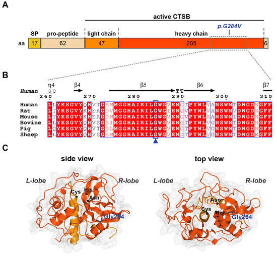 To address the potential significance of the p.Gly284Val substitution, we first inspected the surrounding sequence and the localization of the residue within the 3D structure of the protein (Figure 3). CTSB is synthesized as a preproenzyme which, upon cleavage of the N-terminal signal and pro-peptide regions, is further processed into the mature, active protease consisting of light and heavy chains (Figure 3A). Although Gly284 does not directly localize to the active site of the enzyme, it resides within a highly conserved region of the heavy chain that folds into the R-lobe of CTSB and may modulate catalytic activity (Figure 3B,C).