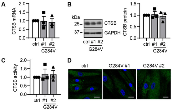 In an attempt to confirm the pathogenicity of CTSB p.Gly284Val, we compared the CTSB expression and activity using fibroblasts derived from patients and controls with matched age, APOE, and MAPT genotypes. Three independent experiments were performed for each functional analysis.