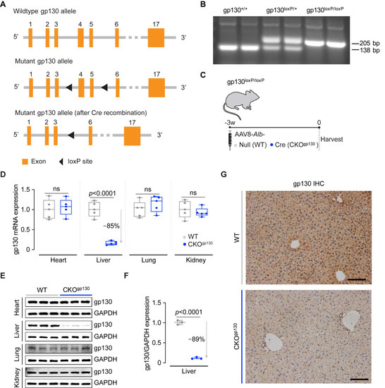 Generation and validation of hepatocyte-specific, gp130-deficient adult mice. (A) Schematic of loxP sites introduced into introns 3 and 5 of the gp130/Il6st locus used for the generation of gp130loxP/loxP mice. (B) Representative genotyping of gp130+/+, gp130loxP/+, or gp130loxP/loxP mice. (C) Schematic showing AAV8-induced, hepatocyte-specific gp130 knockout mice (CKOgp130) for data shown in (D–G). (D) gp130 mRNA (n = 5/group) and (E) gp130 protein expression (n = 3/group) in the heart, liver, lung, and kidney. (F) Densitometry analysis (n = 3/group) and (G) a representative IHC staining image of gp130 expression in mice liver (scale bars, 200 µm). (D,F) Data are shown in a box-and-whisker plot with median (middle line), 25th–75th percentiles (box), and minimum-maximum values (whiskers); 2-tailed Student’s t-test.