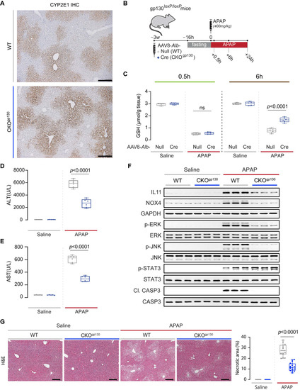 Hepatic CYP2E1 and glutathione levels and serum and molecular markers of liver injury in mice with hepatocyte-specific gp130 deletion and control mice. (A) Representative immunohistochemistry images (scale bars, 200 µm; representative dataset from n = 3 mice/group). (B) Schematic of APAP induction in wild-type (WT) and CKOgp130 mice: overnight-fasted mice were injected with saline or APAP (400 mg kg−1); livers and serum were collected either 0.5, 6, or 24 h post-APAP dosing for experiments shown in (C–F) and Figure 3. (C) Hepatic GSH concentrations at 0.5 and 6 h post-APAP. (D) ALT, (E) AST, and (F) Western blots of IL11, NOX4, GAPDH, p-ERK, ERK, p-JNK, JNK, p-STAT3, STAT3, Cl. CASP3, and CASP3 (n = 3/group) at 6 h post-APAP. (G) Representative H&E-stained liver images (scale bars, 200 µm) at 6 h post-APAP dosing and quantification of liver necrotic area. (C–E,G) Data are shown in a box-and-whisker plot with median (middle line), 25th–75th percentiles (box) and min-max values (whiskers), with a 2-way ANOVA with Sidak’s correction; 0.5 h time point: saline (n = 4 mice/genotype), APAP (n = 4 mice/genotype), 6: saline (n = 5 mice/genotype), APAP (n = 6 mice/genotype).