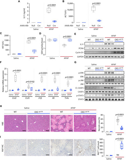 Hepatocyte-specific deletion of gp130 limits APAP-induced liver injury and promotes hepatic regeneration 24 h after injury. (A) Serum IL11 levels, (B) serum ALT levels, (C) serum AST levels, (D) hepatic GSH levels, (E) Western blots showing hepatic levels of IL11, PCNA, Cyclin D1, and GAPDH as internal contro (n = 3/group)l, (F) hepatic mRNA expression of pro-inflammatory markers (Ccl2, Ccl5, Il1β, Il6, Tnfα), (G) Western blots showing hepatic levels of p-ERK, ERK, p-JNK, JNK, Cl. CASP3, CASP3, p-STAT3, and STAT3 (n = 3/group), (H) representative H&E-stained liver images (scale bars, 200 µm) and quantification of liver necrotic area, (I) IHC staining of Ki67 in the livers of mice (scale bars, 200 µm) and quantification of Ki67+ve cells for experiments shown in Figure 2B. (A–D,F,H,I) Saline (n = 5 mice/genotype), APAP (n = 6 mice/genotype); data are shown in a box-and-whisker plot with median (middle line), 25th–75th percentiles (box), and min-max values (whiskers), with a 2-way ANOVA with Sidak’s correction.