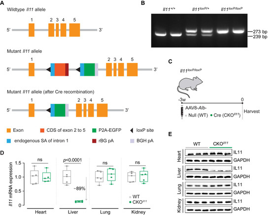 Generation and validation of hepatocyte-specific Il11-deficient adult mice. (A) Schematic design showing the deletion of exons 2–5 of the mouse Il11 locus and the gene targeting strategy. (B) Representative genotyping of Il11+/+, Il11loxP/+, or Il11loxP/loxP mice. (C) Schematic showing AAV8-induced hepatocyte-specific Il11 knockout mice (CKOIl11). (D) Il11 mRNA (n = 5/group) and (E) IL11 protein (n = 3/group) expression in the heart, liver, lung, and kidney from WT and CKOIl11 mice. (D) Data are shown in a box-and-whisker plot with median (middle line), 25th–75th percentiles (box), and minimum-maximum values (whiskers), with a 2-tailed Student’s t-test.