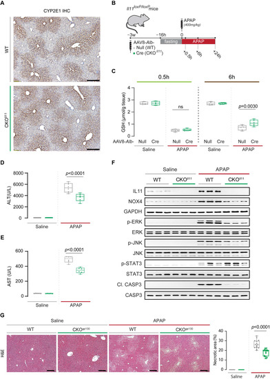 Hepatic CYP2E1 and glutathione levels and serum and molecular markers of liver injury in mice with hepatocyte-specific Il11 deletion and control mice. (A) Representative immunohistochemistry images (scale bars, 200 µm; representative dataset from n = 3 mice/group). (B) Schematic of induction of APAP injury in wild-type (WT) and CKOIl11 mice: overnight-fasted mice were intraperitoneally injected with saline or APAP (400 mg kg−1); livers and serum were collected either 0.5, 6, or 24 h following APAP administration for experiments shown in (C–F) and Figure 6. (C) Hepatic GSH concentrations at 0.5 and 6 h post-APAP. (D) ALT, (E) AST, and (F) Western blots of IL11, NOX4, GAPDH, p-ERK, ERK, p-JNK, JNK, Cl. CASP3, and CASP3 at 6 h post-APAP. (G) Representative H&E-stained liver images (scale bars, 200 µm) at 6 h post-APAP dosing quantification of the liver necrotic area. (C–E,G) Data are shown in a box-and-whisker plot with median (middle line), 25th–75th percentiles (box), and min-max values (whiskers), with a 2-way ANOVA with Sidak’s correction; 0.5 h time point: saline (n = 4 mice/genotype), APAP (n = 4 mice/genotype), 6 h time point: saline (n = 5 mice/genotype), APAP (n = 6 mice/genotype).