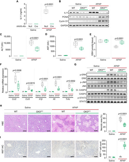 Hepatocyte-specific deletion of Il11 reduces APAP-induced liver injury and promotes hepatic regeneration 24 h after injury. (A) Serum IL11 levels, (B) Western blots showing hepatic levels of IL11, PCNA, Cyclin D1, and GAPDH as the internal control (n = 3/group), (C) serum ALT levels, (D) serum AST levels, (E) hepatic GSH levels, (F) hepatic mRNA expression of pro-inflammatory markers (Ccl2, Ccl5, Il1β, Il6, Tnfα), (G) Western blots showing hepatic levels of p-ERK, ERK, p-JNK, JNK, Cl. CASP3, CASP3, p-STAT3, and STAT3 (n = 3/group), (H) representative H&E-stained liver images (scale bars, 200 µm) and quantification of the liver necrotic area, (I) IHC staining of Ki67 in the livers of mice (scale bars, 200 µm) and quantification of Ki67+ve cells for experiments shown in Figure 5B. (A,C–F,H,I) Saline (n = 5 mice/genotype), APAP (n = 6 mice/genotype); data are shown in a box-and-whisker plot with median (middle line), 25th–75th percentiles (box), and min-max values (whiskers), with a 2-way ANOVA with Sidak’s correction.