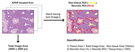 Livers were fixed for 48 h at room temperature (RT) in 10% neutral-buffered formalin (NBF), dehydrated, embedded in paraffin blocks, and sectioned at 7 μm. Sections were stained with H&E according to standard protocol and examined by light microscopy. Quantification of liver necrosis area was performed using ImageJ Fiji (version 1.50, National Institute of Health, Bethesda, MD, USA) by measuring H&E-negative areas (areas inside the red lines) relative to the tissue area (area of the whole image excluding the areas inside the yellow line) from 3 randomly selected 100× field images from each liver. A figure exemplifying the quantification analysis is provided below (Figure 7). ROI: Region of interest.