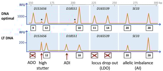 Modern commercial STR kits are highly sensitive and can establish full profiles from as little as 125 pg of genomic DNA [,,]. (A human cell contains 6.6 pg of nuclear DNA). At lower concentrations, single alleles or loci may escape detection. Even running more PCR cycles will not overcome this limit, which shows that it is not just analytical in nature. Rather, the limit reflects the occurrence of stochastic sampling effects []. These may have two explanations: First, in a trace with a DNA amount corresponding to only few genomic copies, some DNA loci may be present in unequal abundancies. Second, if in a DNA sample only few genomic copies are present, any fraction to be analyzed may no longer represent the complete genome. As a consequence, alleles will be underrepresented or absent, resulting in typical stochastic effects on electropherograms (Figure 1), such as pronounced peak height imbalances between loci or between the two alleles of one locus (allelic imbalances, AI), or allele peaks being completely missing (allele drop-out, ADO) []. Low DNA amounts analytically entailing stochastic effects are referred to as low template DNA (LT DNA) (also termed low copy number DNA, LCN DNA) [] and warrant more sensitive analytical procedures, which in turn may evoke additional artifacts, such as allele drop-ins (ADI). On electropherograms, ADIs present as peaks that resemble normal allele peaks and may result from the amplification of contaminants (present in the sample, in the equipment or in reagents). Furthermore, they may be due to replication slippage events occurring during early PCR cycles when still only a few template molecules are present, such that resulting stutter fragments may become prominent [].